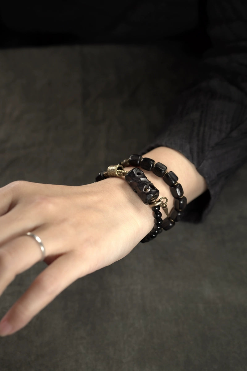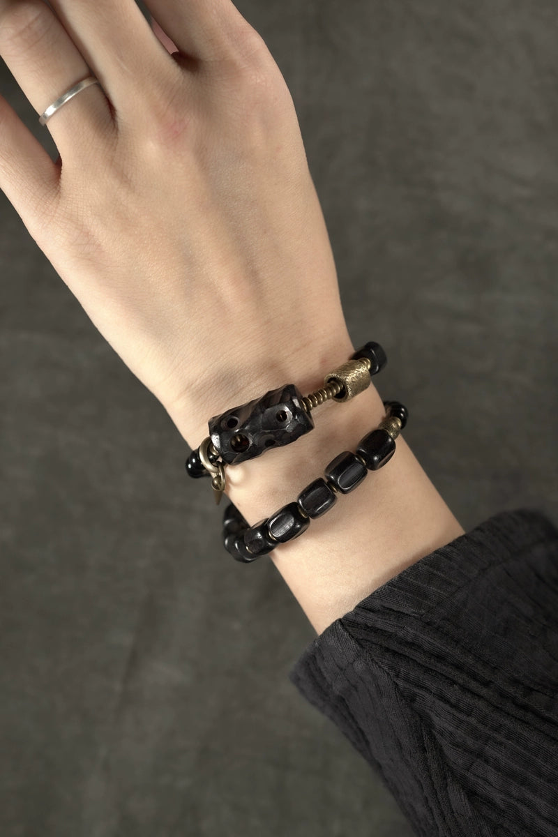 Ebony wood is legendary for its density, durability, and deep, unyielding color. It is a natural symbol of strength, endurance, and the ability to withstand pressure. The hand-carved focal bead and barrel beads feel solid and substantial, serving as a constant tactile reminder of your own innate resilience. Paired with the defiant energy of the copper spike, this bracelet encourages you to embrace your inner power, persevere through adversity, and emerge stronger from every trial.