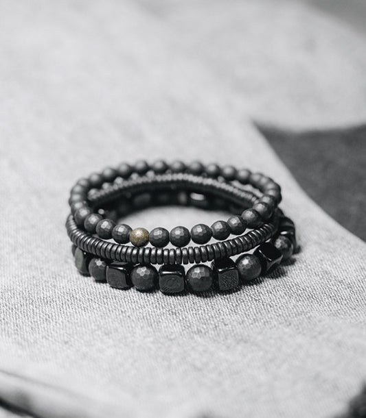 Men's Black Agate & Ebony Wood 3-Piece Bracelet Set (Matte & Faceted)
