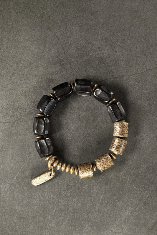 Hand-Textured Ebony Wood and Vintage Brass Cylinder Mens Beaded Bracelet