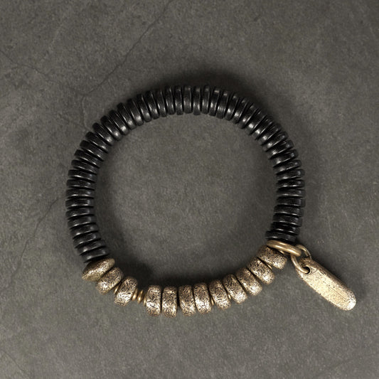 Black Ebony Wood & Textured Vintage Brass Heishi Bracelet (Industrial Style)