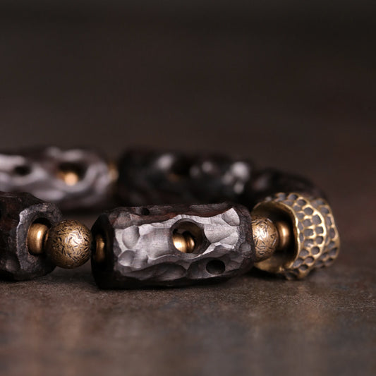 Hand-Carved Ebony and Textured Brass Beaded Bracelet for Men
