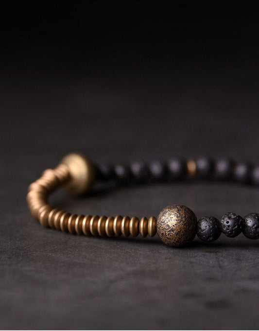 Mens Beaded Bracelet with Lava Stone and Hammered Brass Accents