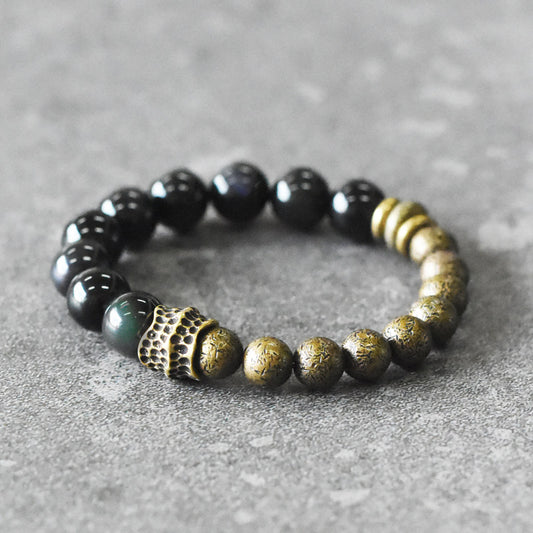 Natural Obsidian & Hammered Vintage Brass Bead Bracelet (Half & Half Style)