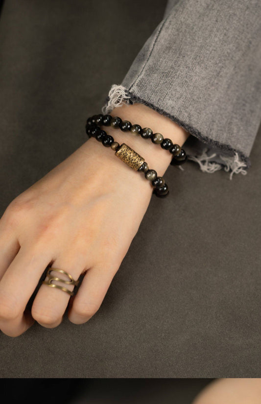 Golden Obsidian 2-Wrap Bracelet with Hammered Vintage Brass Tube (Unisex)