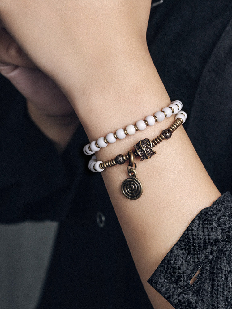 Double-Layer White Deer Bone Buddha Bracelet with Vintage Brass Accents