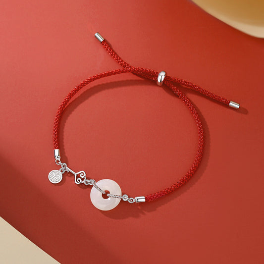S925 Silver & Natural Hetian Jade Donut Red String Bracelet with Ruyi Key (Adjustable)
