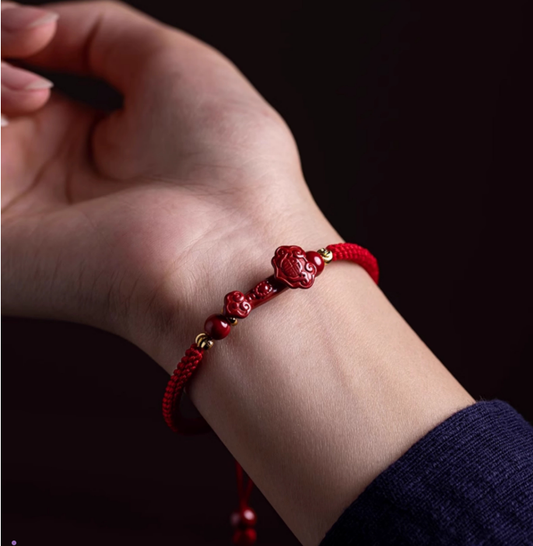 Carved Cinnabar & Red String Fengshui Bracelet for Luck & Protection