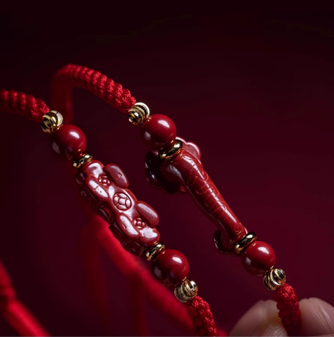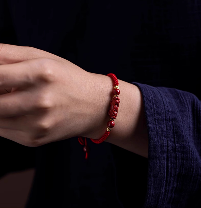 Carved Cinnabar & Red String Fengshui Bracelet for Luck & Protection