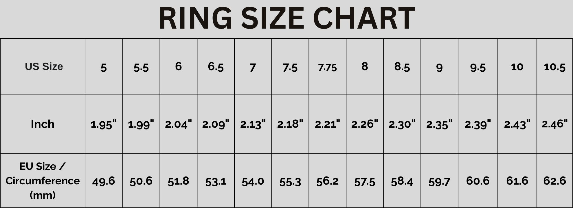 For a comfortable fit, your finger circumference should be approximately 1mm smaller than the ring's inner circumference.