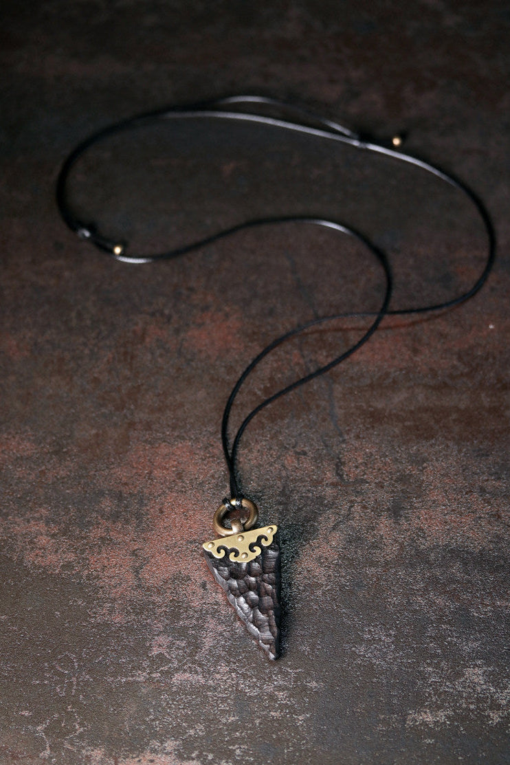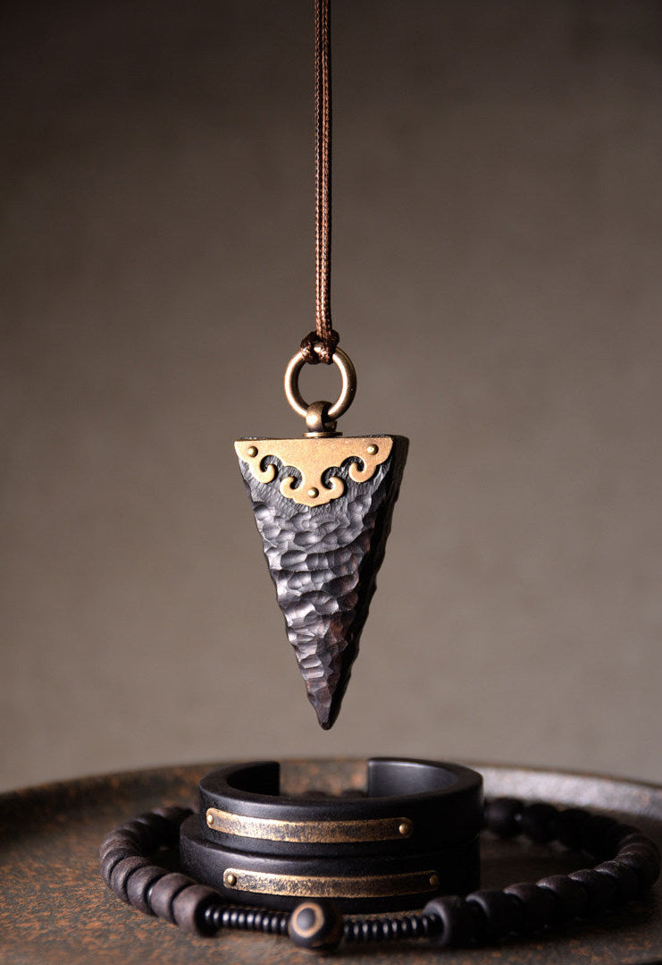 Hand-Carved Ebony Arrowhead and Filigree Brass Necklace