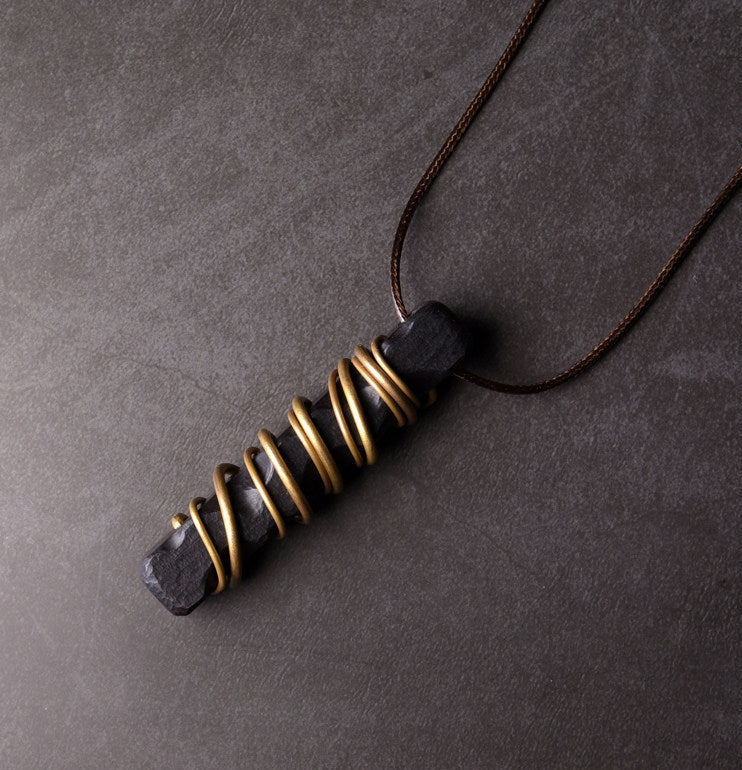 Every pendant is uniquely hammered to create a rugged, organic "skin" on the wood. This tactile experience makes it a premier choice for those who appreciate men's copper jewelry with a vintage, lived-in aesthetic. The brass wire is meticulously hand-wrapped around the ebony, symbolizing the interconnectedness of nature and human craftsmanship.