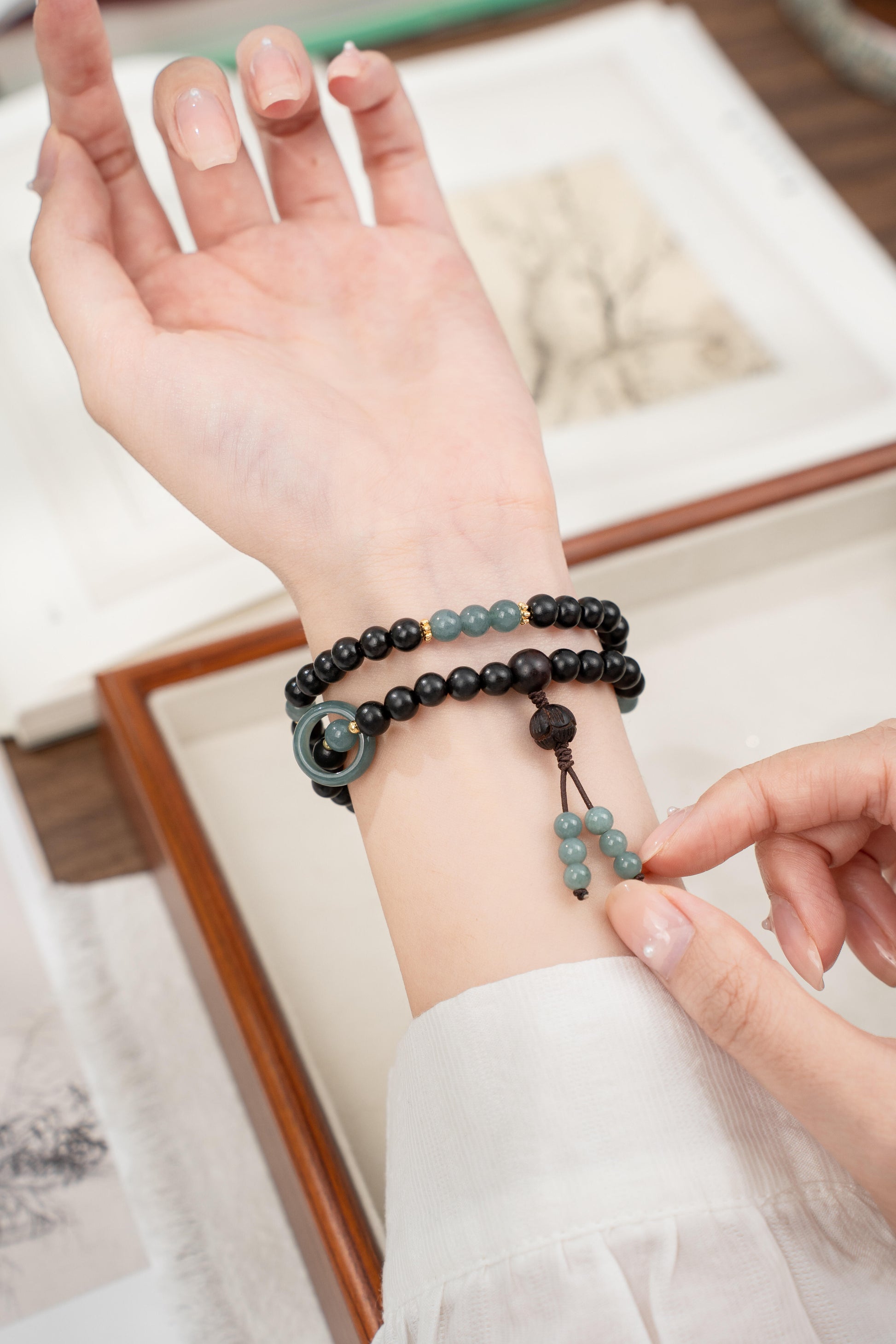 <p>Interspersed throughout the dark wood are beads of <strong>Blue Water Jadeite</strong>, shimmering with cool, translucent hues like a hidden forest stream. This is not just any <strong>jade bracelet</strong>; it's a conduit for serene energy. Jade is known for promoting harmony and healing, while the specific "Blue Water" quality is associated with purification and emotional flow. It encourages mental clarity, helping to wash away stress and allow your thoughts to move with grace and ease, much like flowing water. Together, these elements create a perfect equilibrium of strength and serenity.</p>