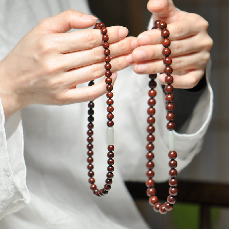 The deep, rich red of the Padauk wood, shimmering with golden specks, paired with the soft, luminous glow of the white jade bracelet bead, creates a look of timeless elegance. This is more than just a buddha with beads; it is a sophisticated and meaningful accessory for anyone seeking to cultivate a life of purity, balance, and well-being.