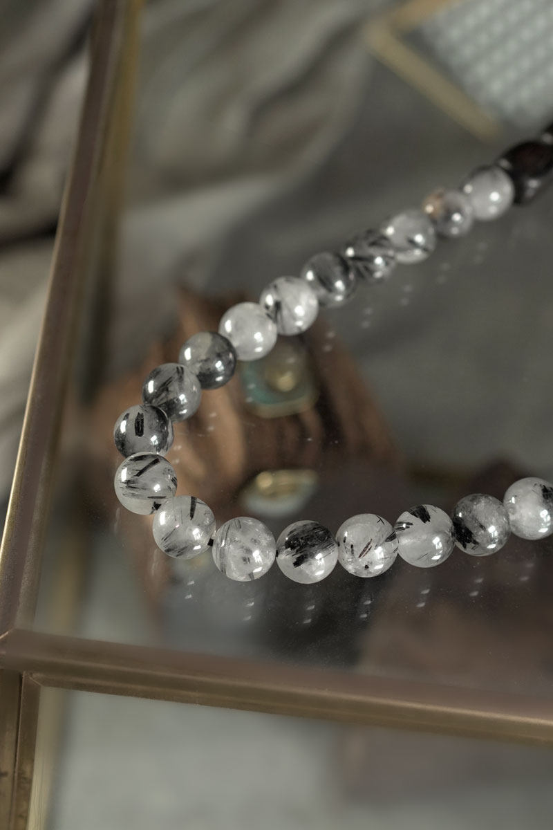 • Quartz Needles: The Black Rutilated Quartz contains natural black needles (Rutile/Tourmaline) trapped inside. The density and pattern of these needles vary in every bead, making each unique.