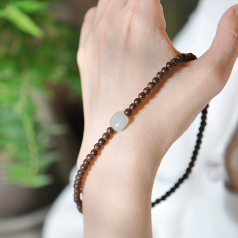 This wooden bead bracelet is a meditation on balance. The warm, earthy energy of the wood and the cool, pure energy of the jade create a perfect harmony. It is a tactile reminder of the interconnectedness of nature and the beauty that arises from the union of different elements. Its subtle fragrance and smooth touch can bring a sense of calm and Peace throughout your day.