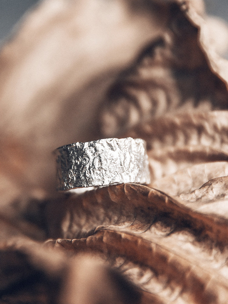 Forged as high-purity 925 sterling silver rings, this collection captures the raw essence of unrefined nature through its deeply hammered, "crumpled" aesthetic. Each band serves as a wearable piece of sculpture, designed for those who appreciate the beauty of imperfection and the strength of authentic craftsmanship.
