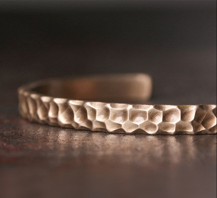 Evoking the rugged spirit of ancient talismans, our JS542 antique brass bracelet is a masterpiece of intentional distress and artisanal craftsmanship. Each piece is hand-wrought with rhythmic hammer strikes, creating a "craters of the moon" texture that serves as a tactile reminder to stay present and grounded in the modern world.
