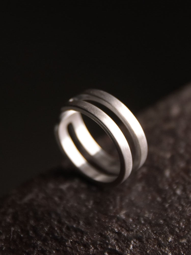 Every one of these handmade rings is finished with a deliberate frosted texture, giving the silver a contemporary, industrial edge. The 7mm (0.28") total width provides a significant visual presence without the bulk of a solid wide band, allowing your skin to breathe between the silver lines. Weighing approximately 4g, it offers a "reassuring weight" that serves as a constant tactile reminder to stay present. The open-back construction ensures a flexible fit for US sizes 6 through 7, allowing the ring to adapt to your body's natural rhythms throughout the day.