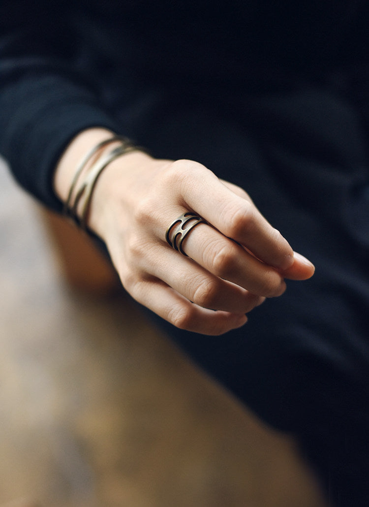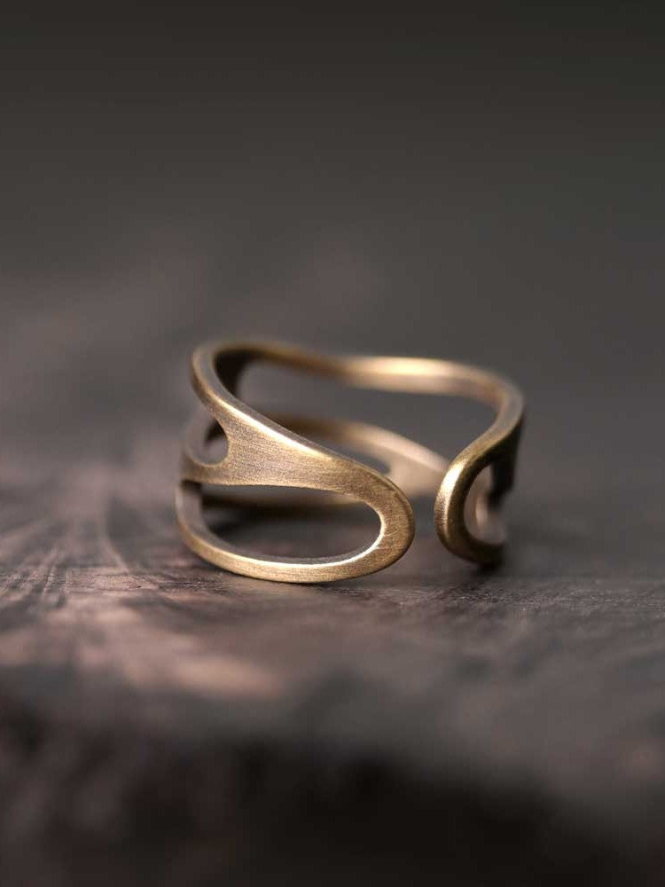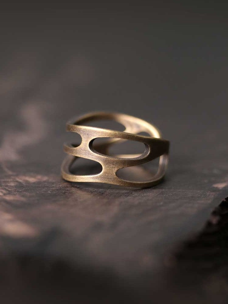 Defined as a centerpiece of our collection of handmade rings, this skeletonized band features an architectural, fluid design that wraps the finger in organic curves. The hand-brushed antique finish creates a soft, weathered glow that feels like a rediscovered relic from a bygone era.