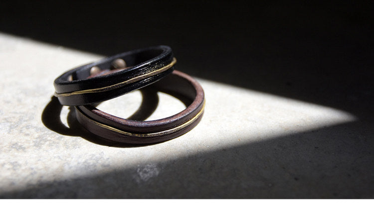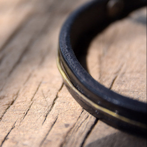 This silhouette redefines the traditional mens bangle bracelet, offering a rugged, architectural wrap that is both substantial and supple. Equally captivating as bangle bracelets for women, the design features a 4mm thick leather band that has been hand-dyed multiple times to achieve a deep, multidimensional patina. The edges are meticulously rounded to ensure a smooth "no-fuzz" finish, while the hand-hammered brass inlay provides a striking industrial contrast that evolves with you.