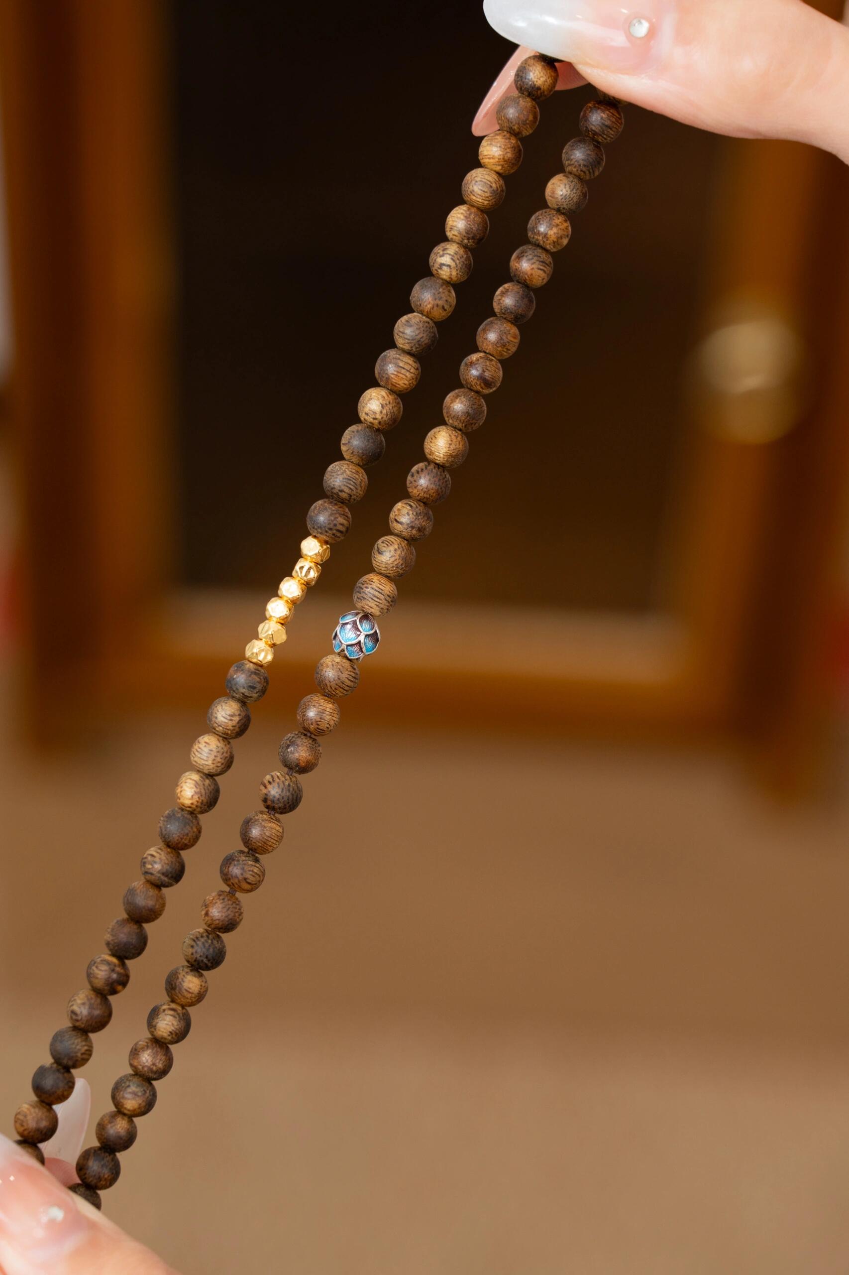 Experience the scent of luxury with this Qinan Agarwood 2-Wrap Bracelet. Crafted from the rare and precious "Qinan" (Kyara) wood, this piece offers a sophisticated, earthy aroma. It is elevated by Gold Vermeil (18k Gold over S925 Silver) accents and a stunning Blue Enamel Lotus, creating a masterpiece of New Chinese aesthetics.