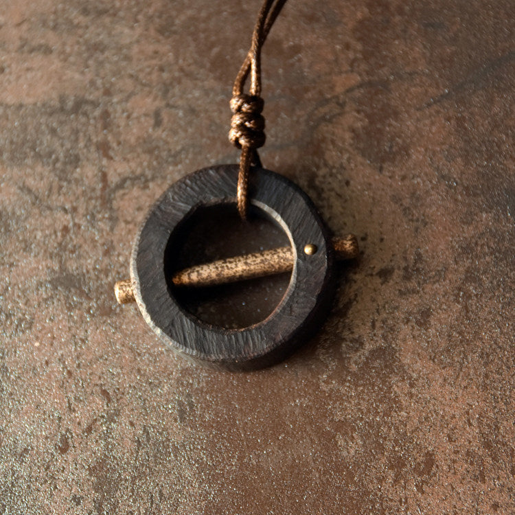 Every surface of this handmade necklace tells a story. The ebony is chiseled to create a tactile, rhythmic "skin" that feels alive to the touch. The brass pillar is individually hammered, ensuring that no two pieces catch the light in exactly the same way. This interplay of dark, organic wood and warm, industrial metal creates a balanced aesthetic suitable for any occasion.
