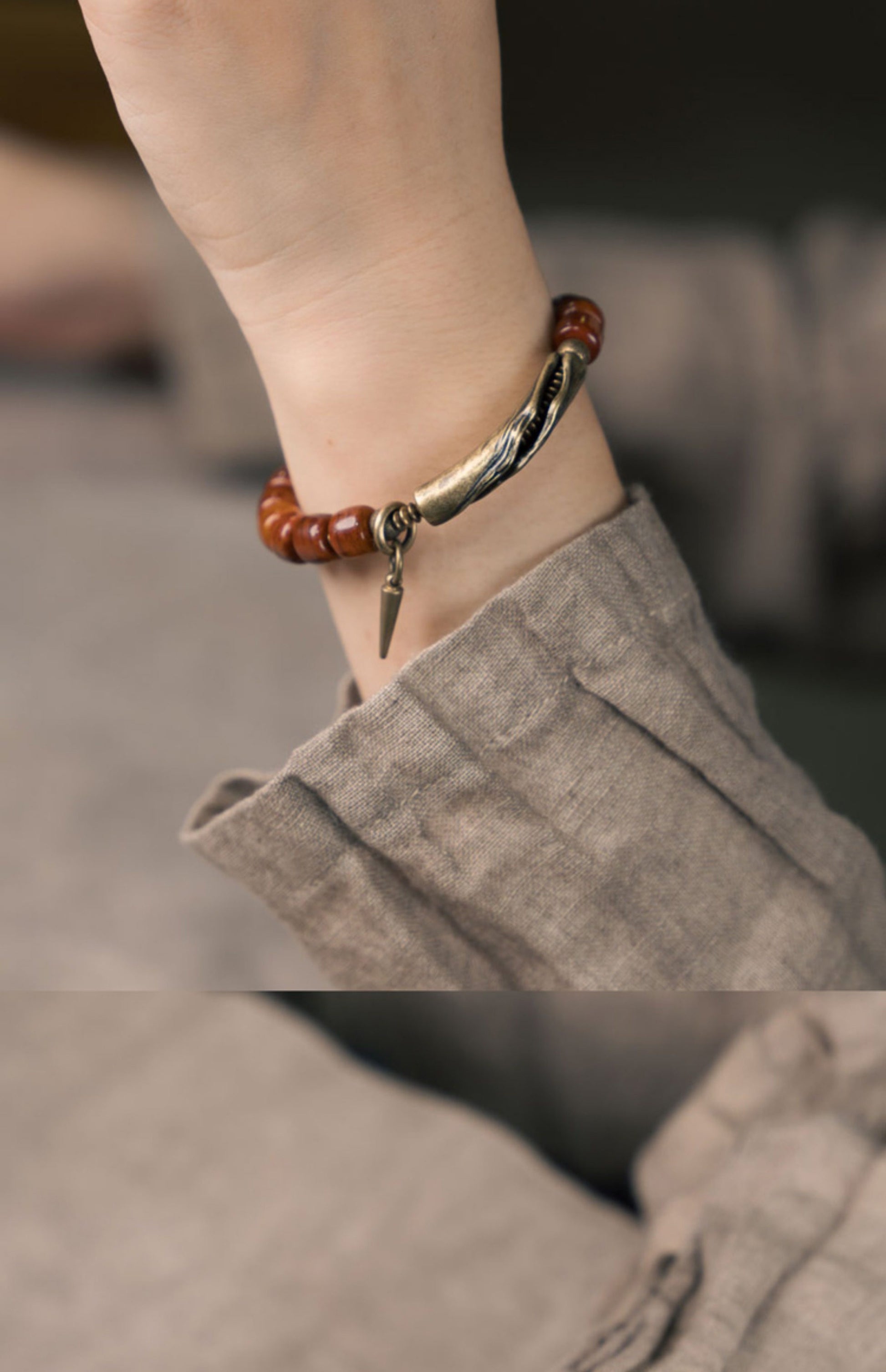• "Aged" Bone Beads: The Ox Bone beads are dyed to a warm Reddish-Brown hue, mimicking the patina of antique prayer beads. Their "Drum" shape creates a smooth, stackable profile.