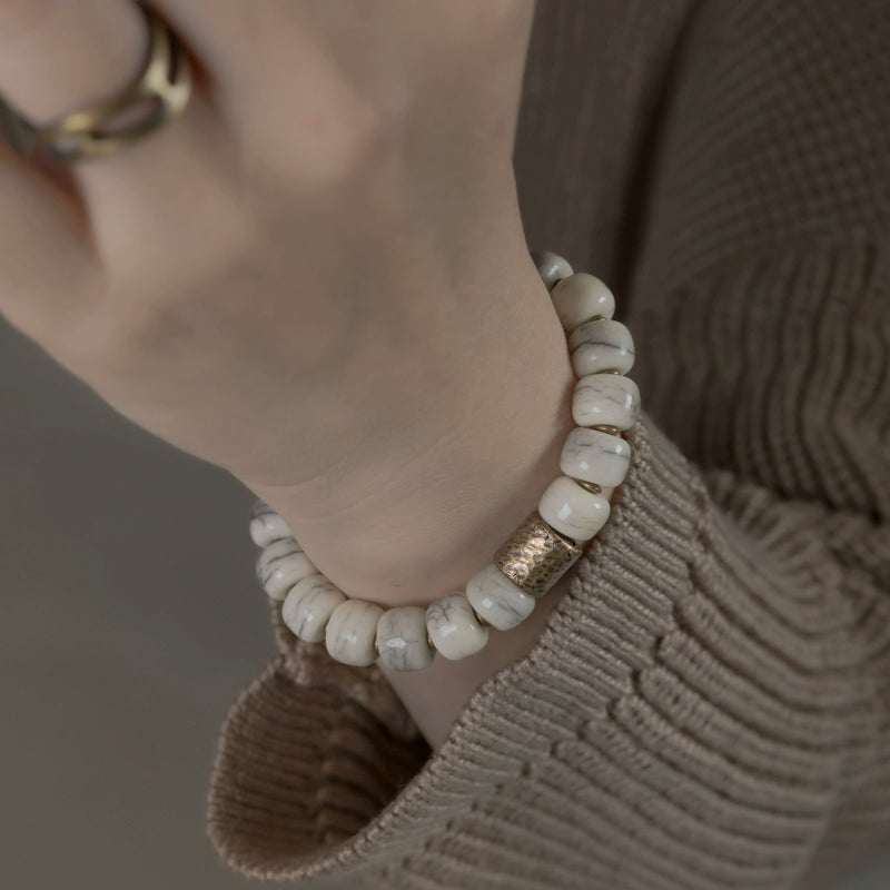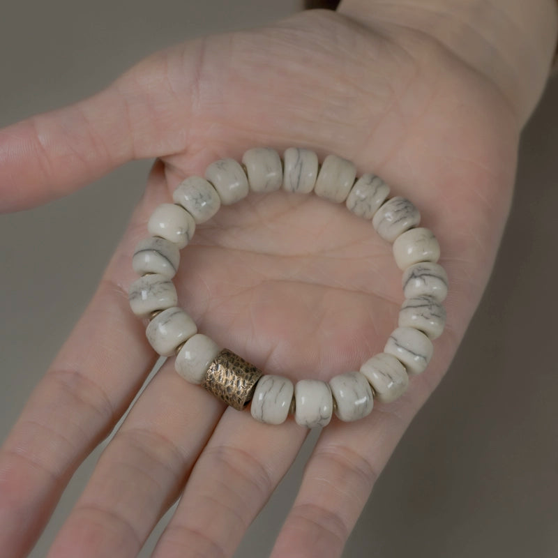 The foundation of each bracelet is a string of beautiful, barrel-shaped ox bone beads, showcasing natural white and grey veining. This neutral, grounding base is then accented with a unique focal piece, allowing you to tailor the bracelet's energy to your personal goals.